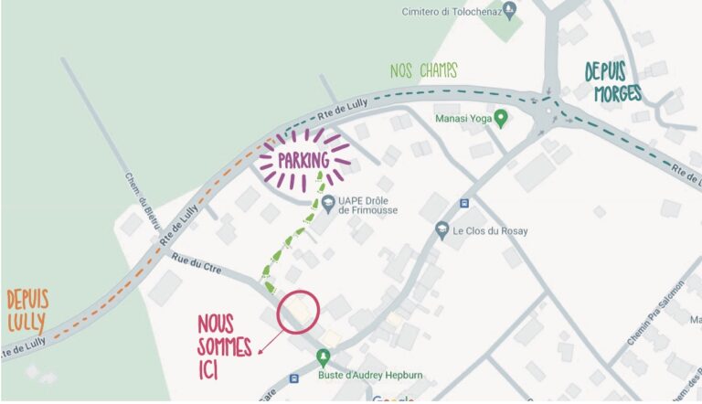 On vous demande néamoins, si vous venez en voiture, de ne pas vous parquer devant la ferme pour ne pas entraver la circulation ou le passage des piétons. Il y a un parking à côté de l’école et qui se trouve juste à côté de la ferme (ci-dessous la photo avec les indications).